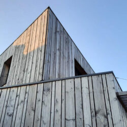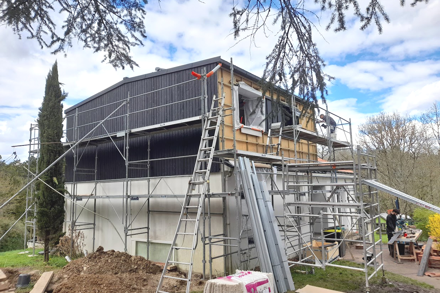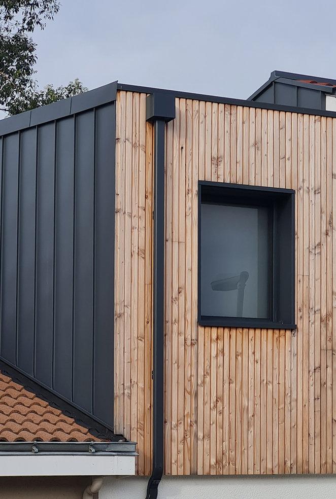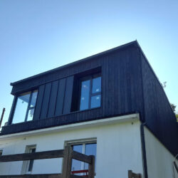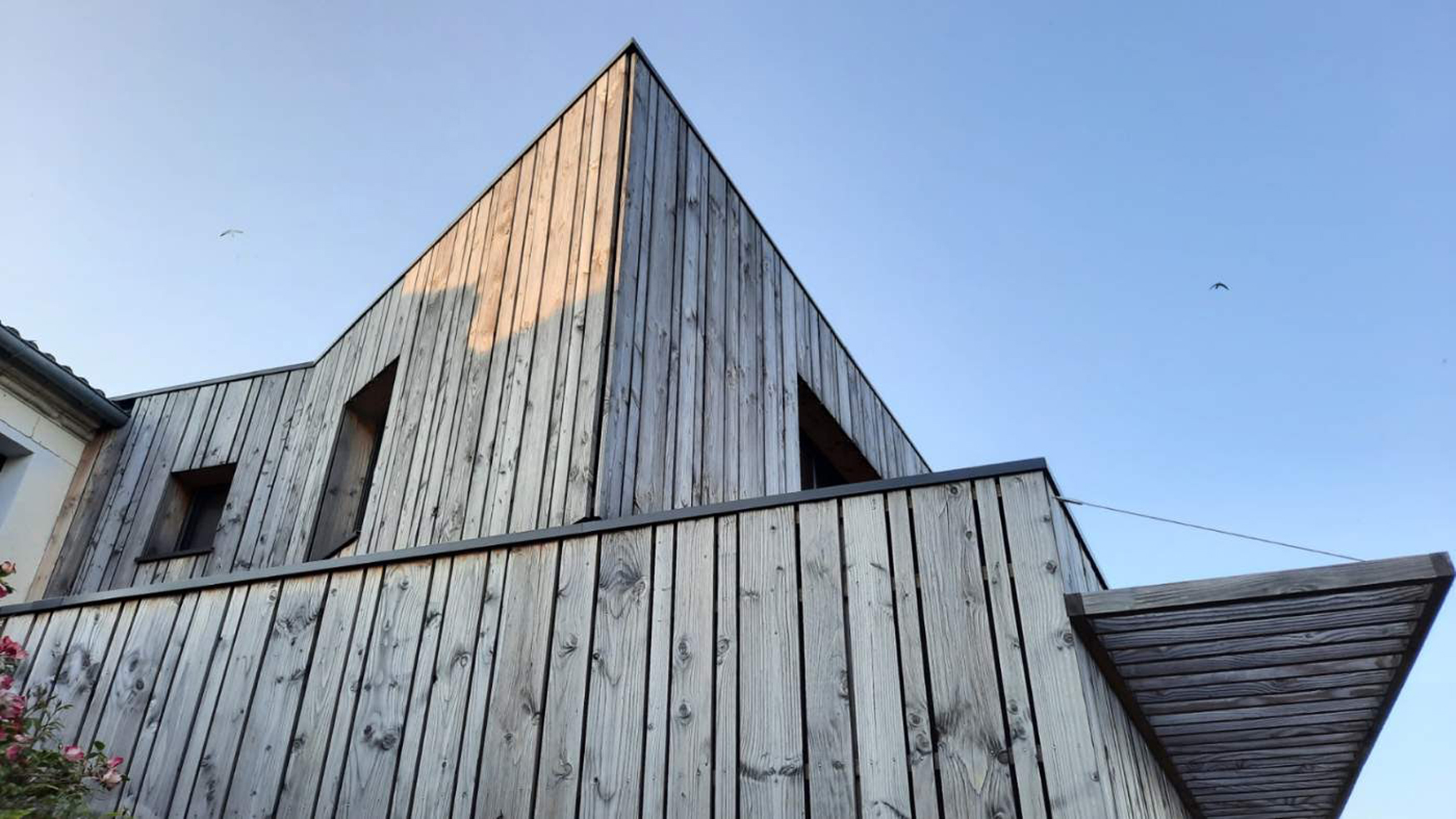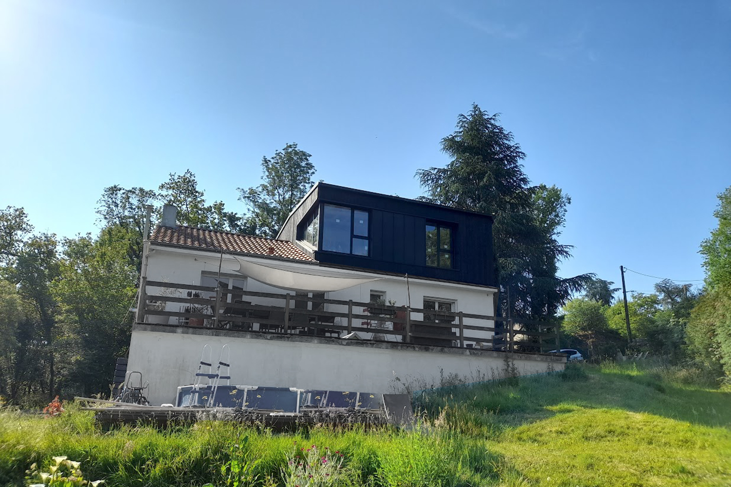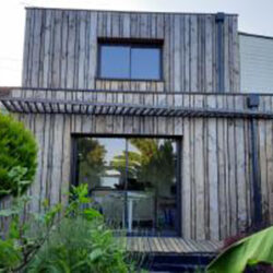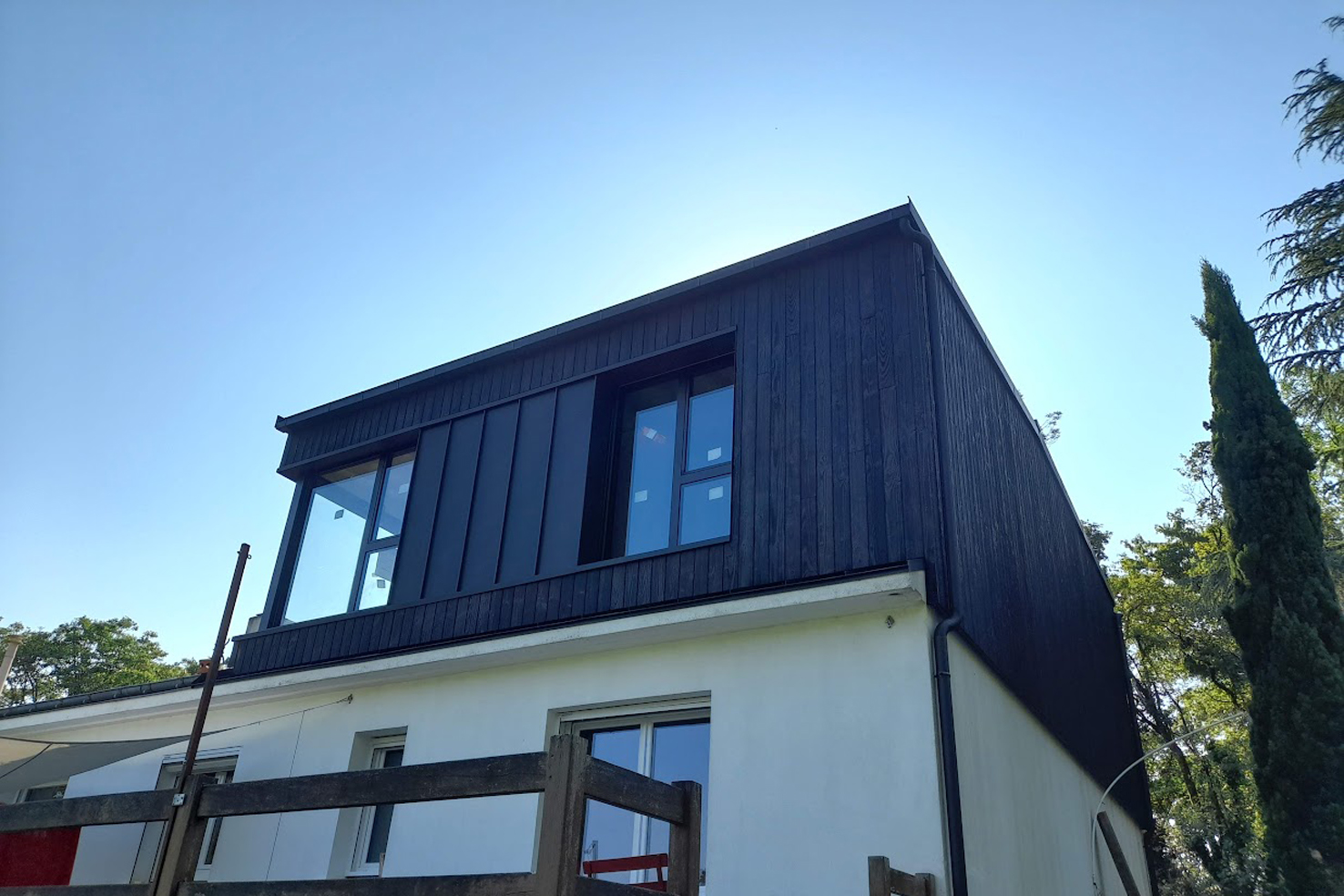 Surélévation en bois brûlé d’une maison, à Vertou, pour améliorer la qualité énergétique de l’ensemble et offrir des espaces ouverts sur le paysage.