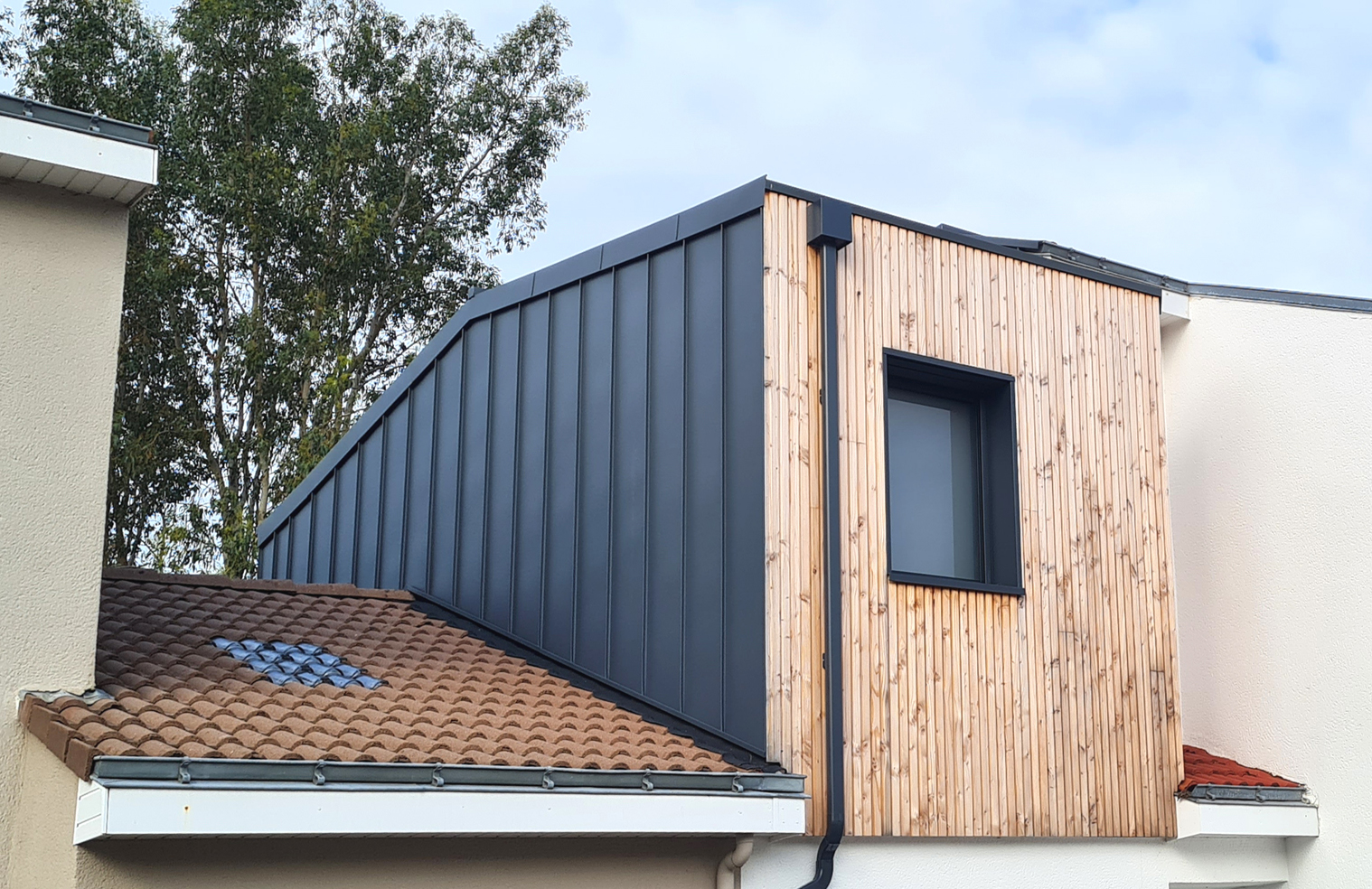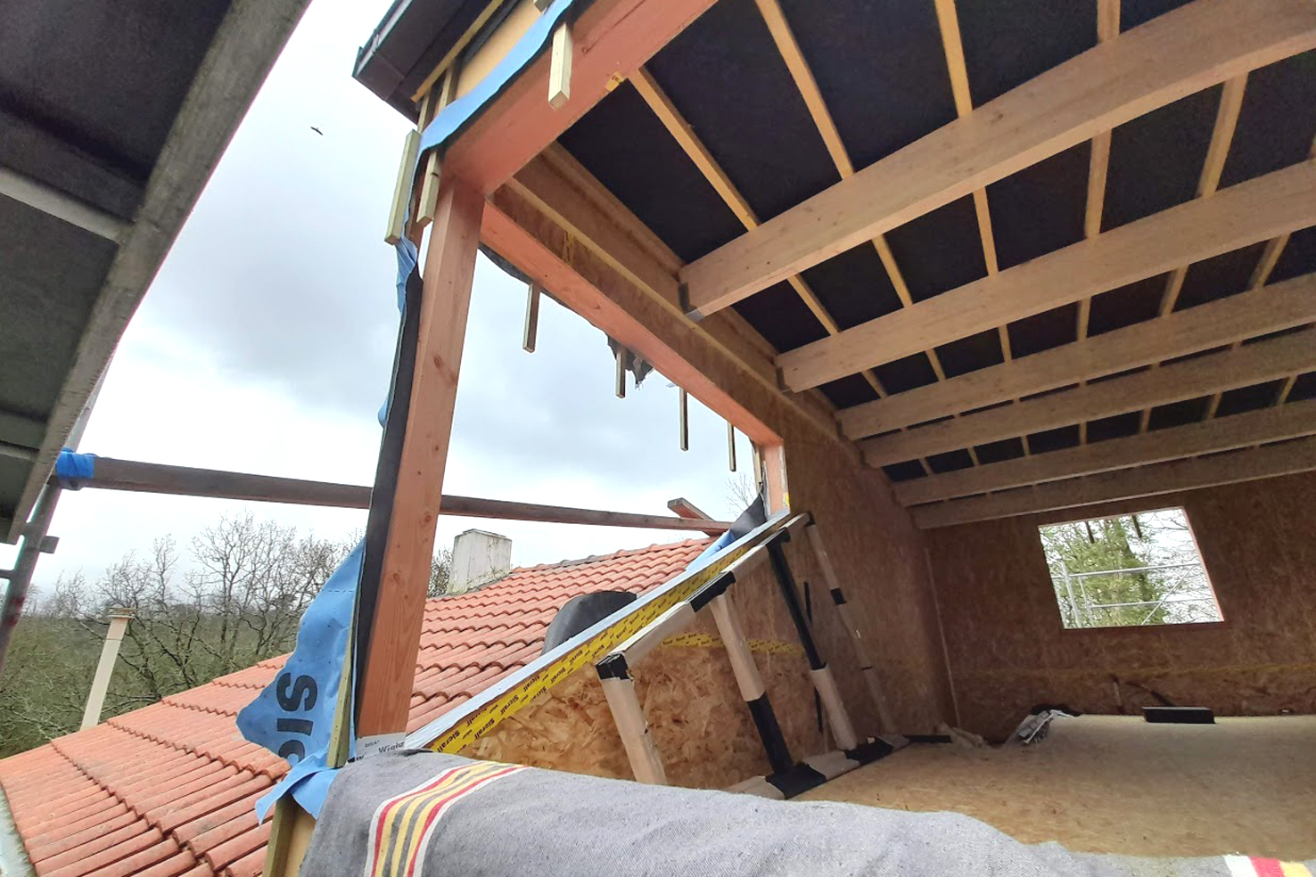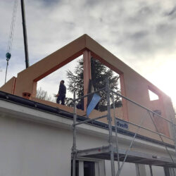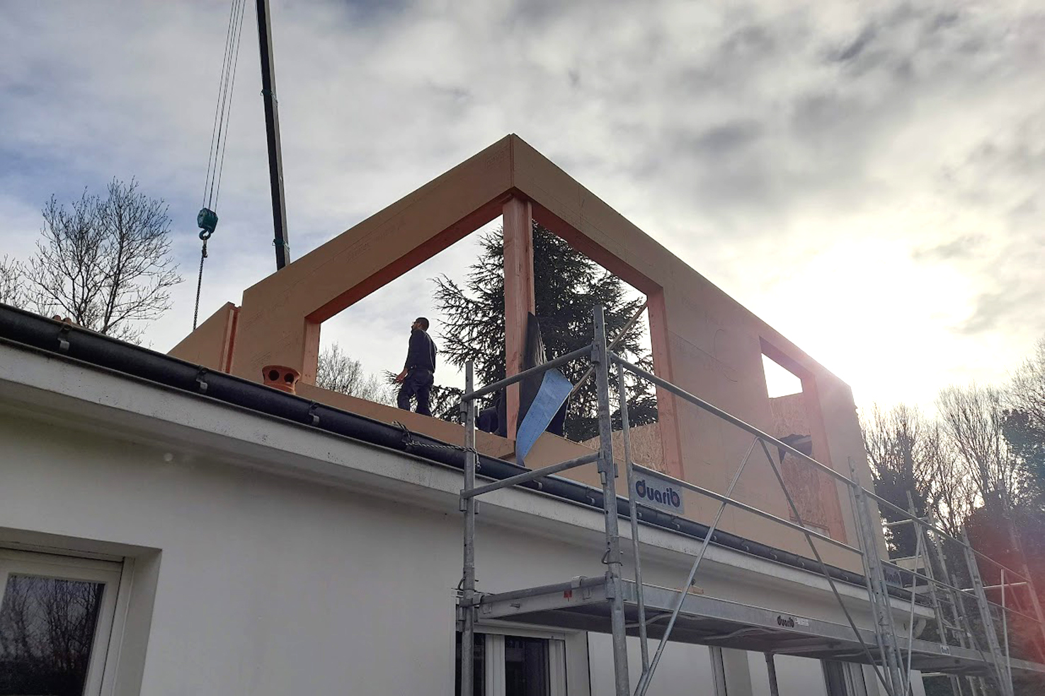 Surélévation d’une maison, à Rezé, pour améliorer la qualité énergétique de l’ensemble et offrir des espaces plus grands pour les chambres.