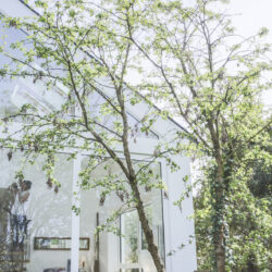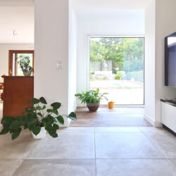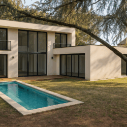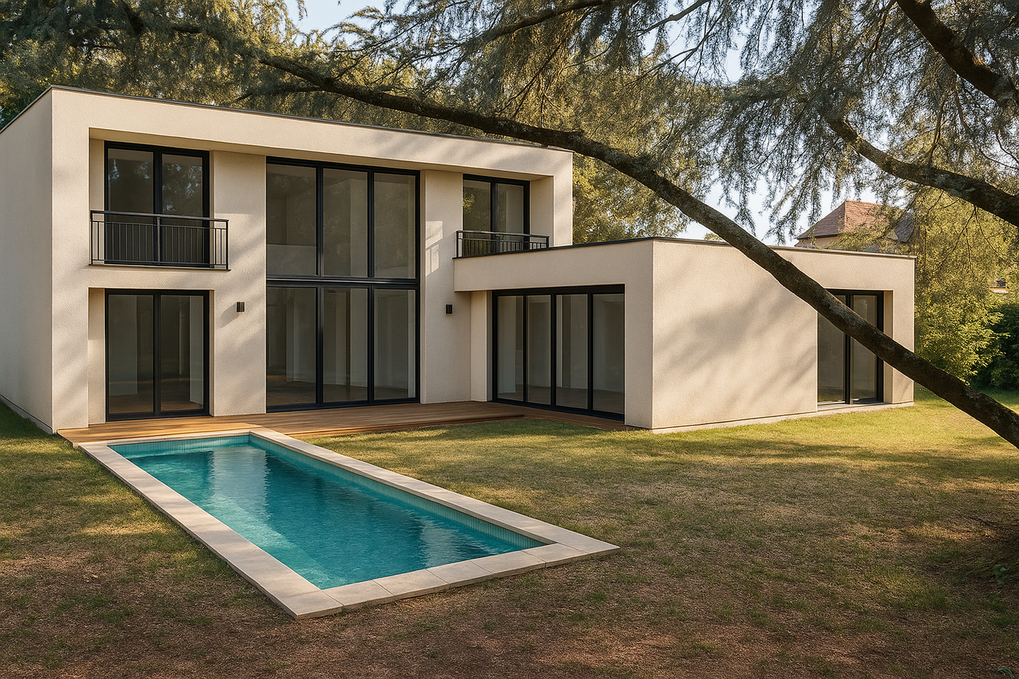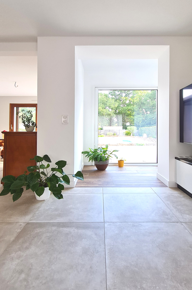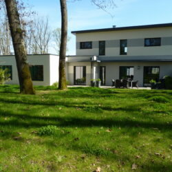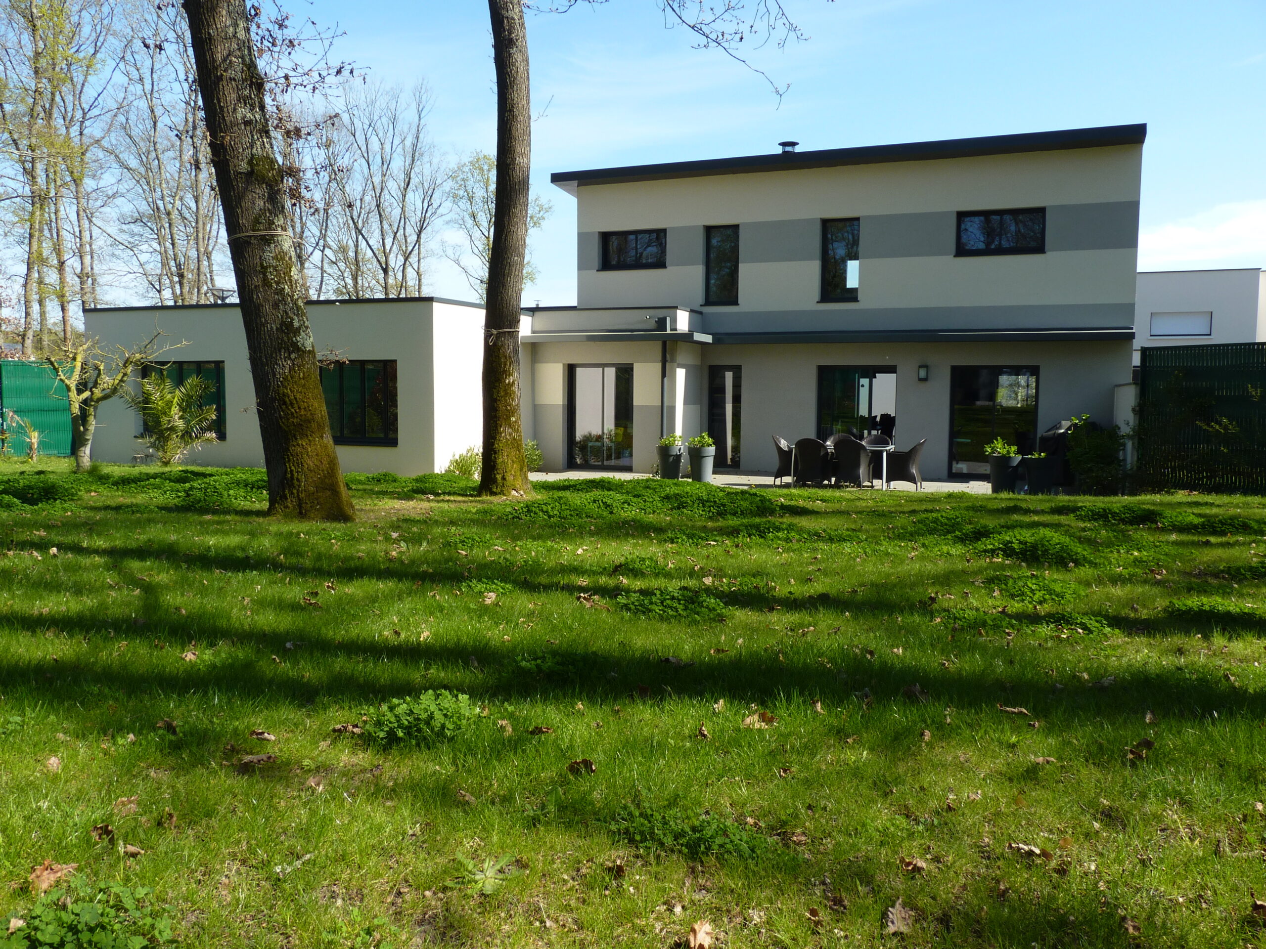 Construction d’une maison individuelle ouverte sur le jardin et ses grands arbres, captant un maximum de lumière naturelle.