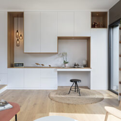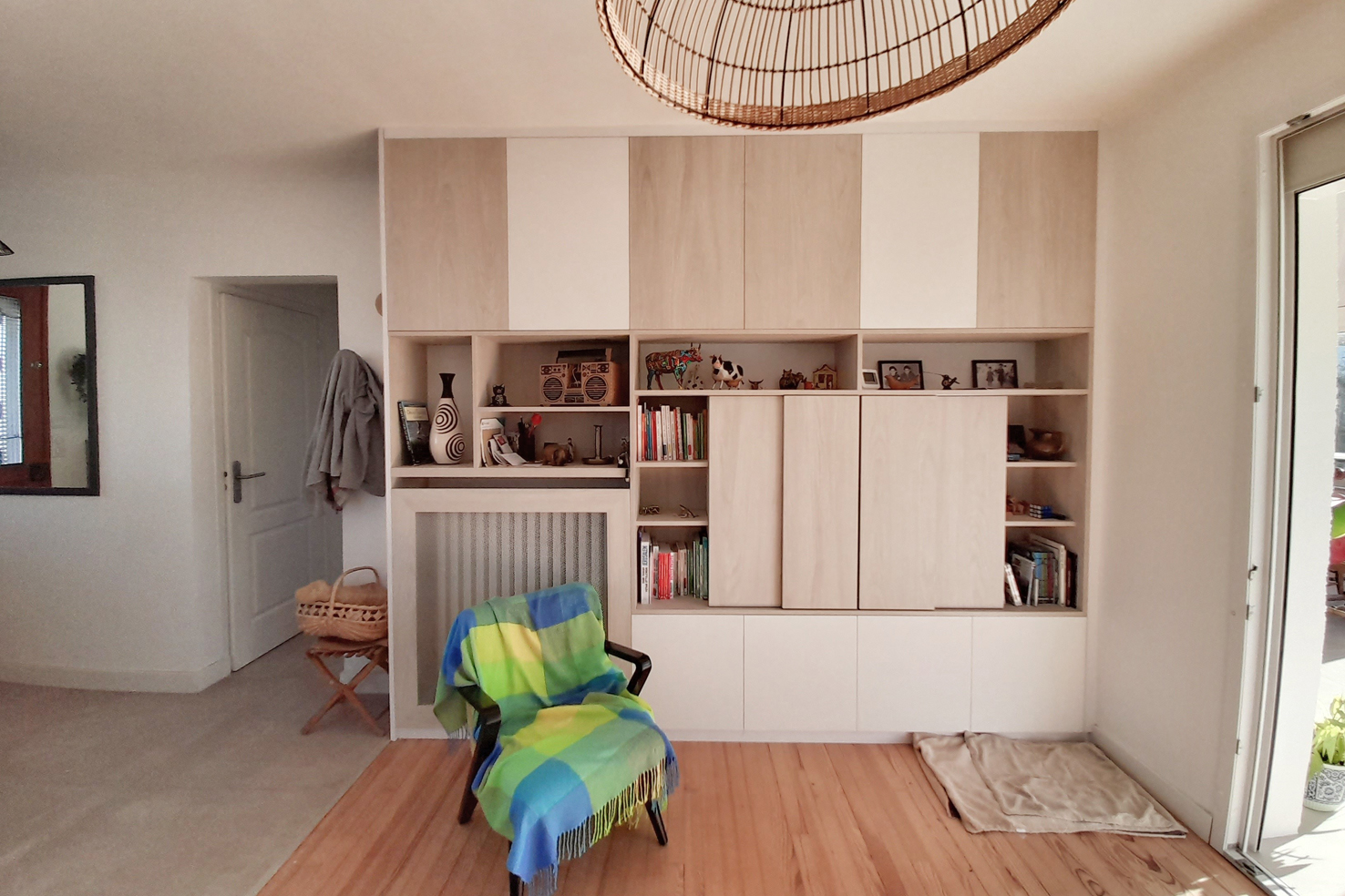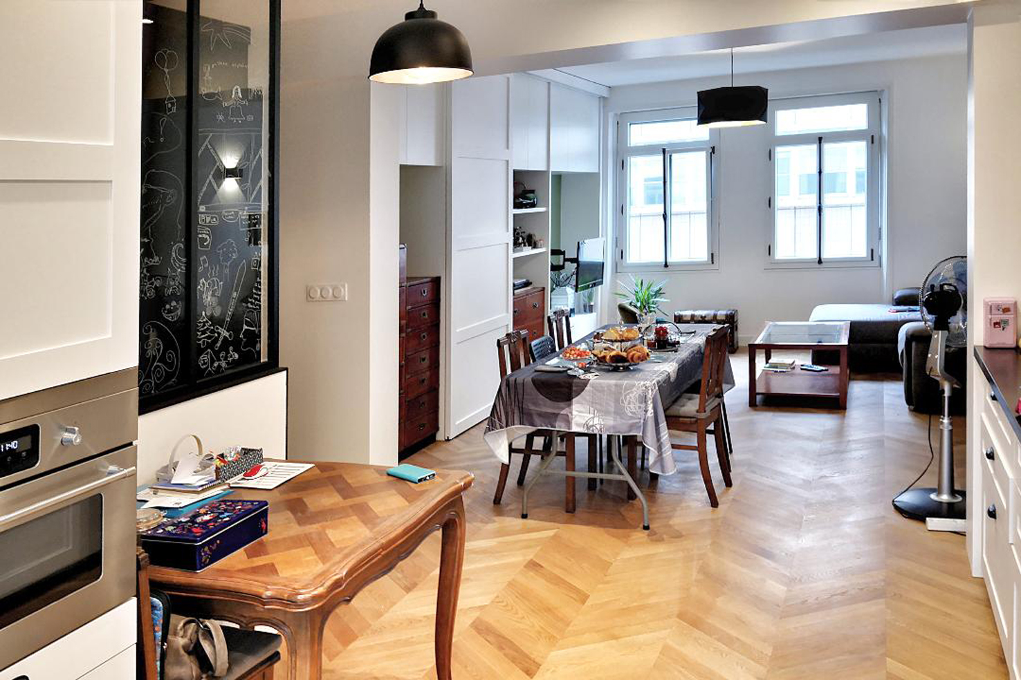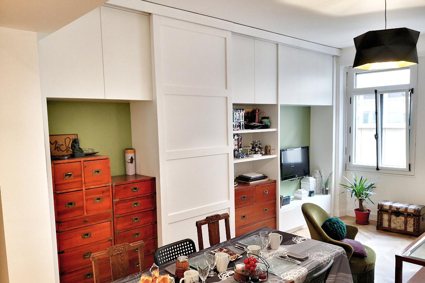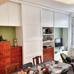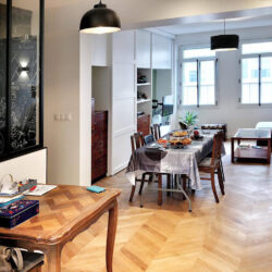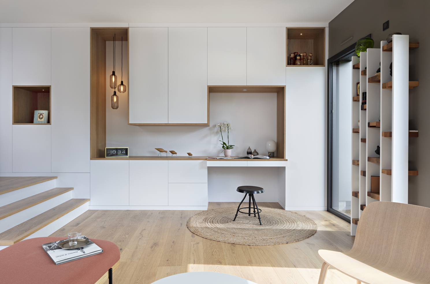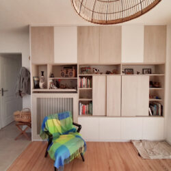 Rénovation d’un appartement en plein cœur de Nantes. Nous avons ouvert les volumes (sur murs porteurs) pour faire entrer la lumière et gagner en usage et en sensation d’espace. Des aménagements sur-mesure viennent optimiser les rangements dans cet appartement.
