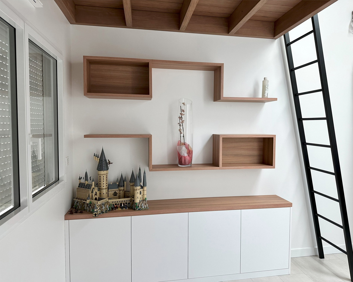 Des meubles dessinés sur-mesure à tous les étages, pour le bureau, la cuisine, la cabane et les salles de bain !