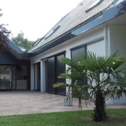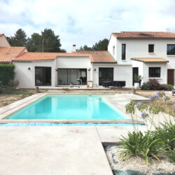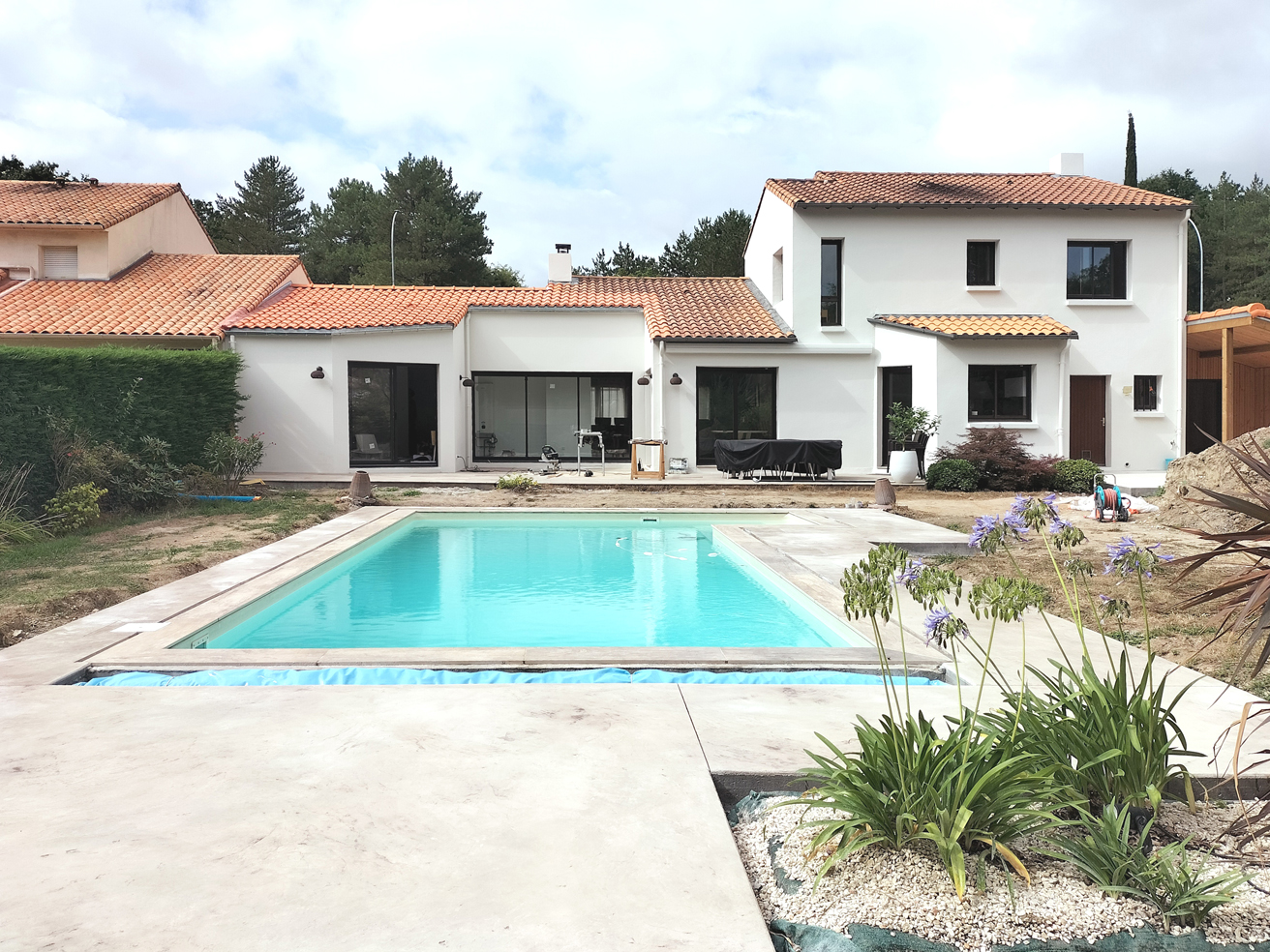 Extension d’une maison, à Basse-Goulaine, dans la continuité de l’existante, pour y accueillir une belle suite parentale au rez-de-jardin. Des isolants en matériaux biosourcés.Rénovation de la piscine avec création des terrasses en béton matricé et la donner à voir depuis la chambre.
