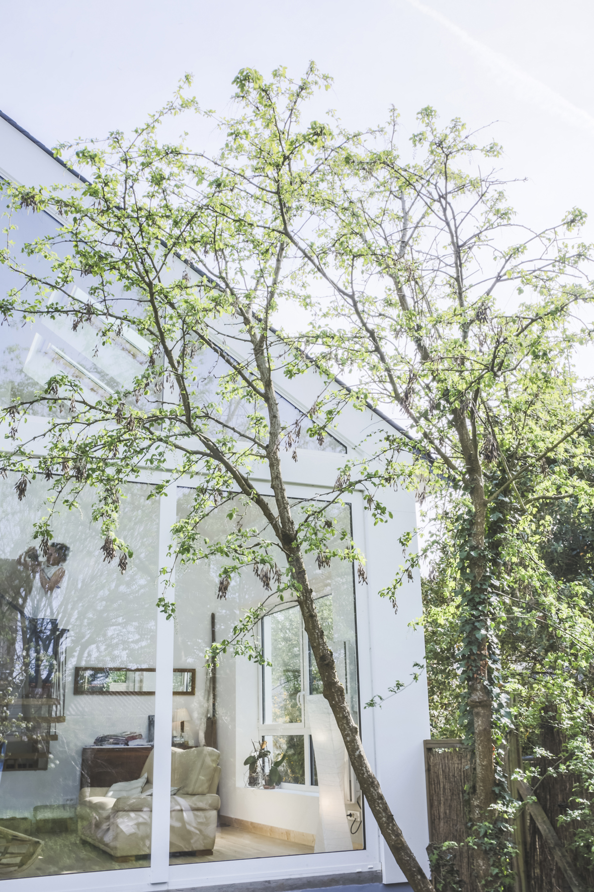 Extension et rénovation d'une maison de ville, au cœur de Nantes. Une pièce à vivre, au cœur du jardin rénové (Thierry Moreau Paysage), pour profiter au maximum de la lumière. Un meuble sur mesure, lien entre l'ancienne maison et l'extension, a été conçu pour accueillir un espace de travail, des rangements et un coin buanderie. Le tout en discrétion !Ameublement et décoration : Home & ConscienceCrédits Photos : @gwenaellehoyet
