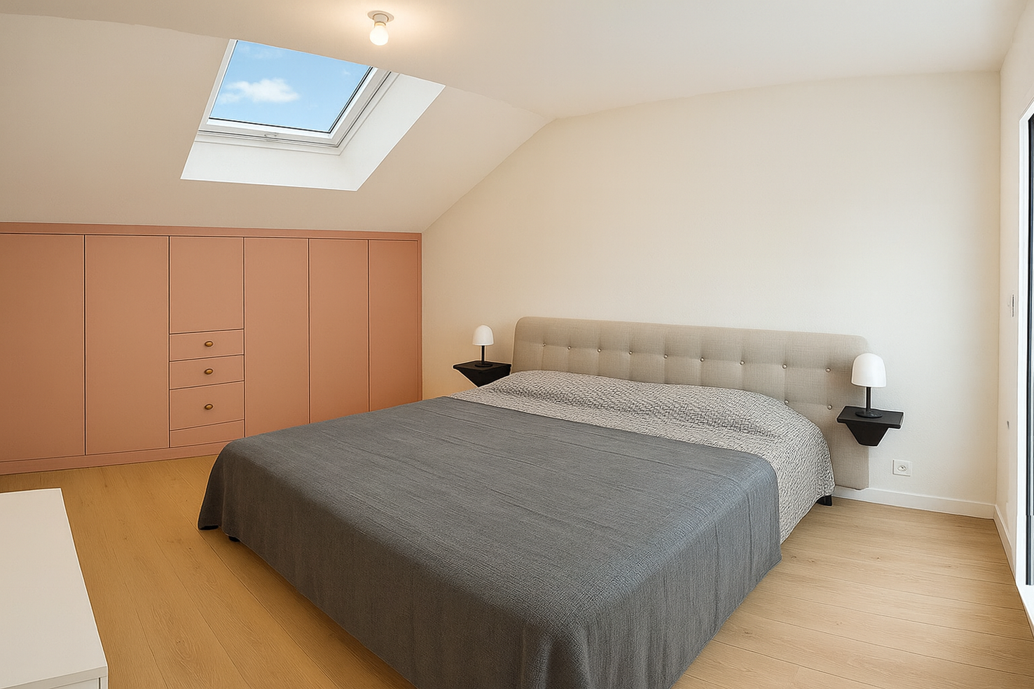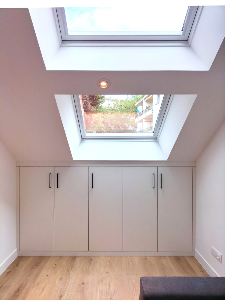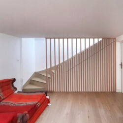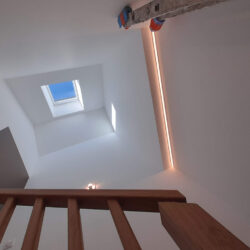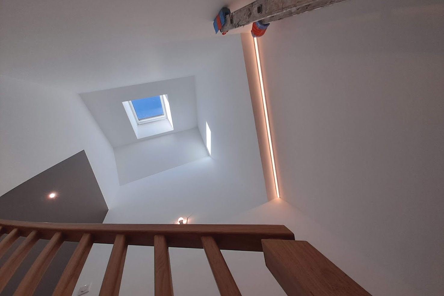 Rénovation et aménagement de combles pour cette maison toute en hauteur à Nantes. Le projet crée une chambre d’adolescente, une nouvelle salle de bain et un espace TV/chambre d’amis.
