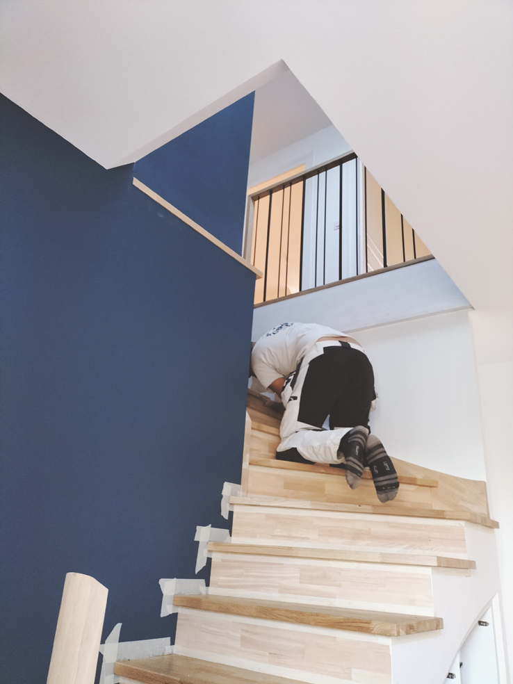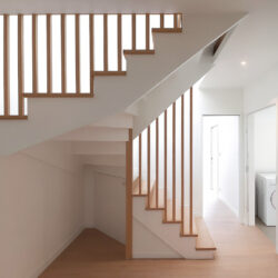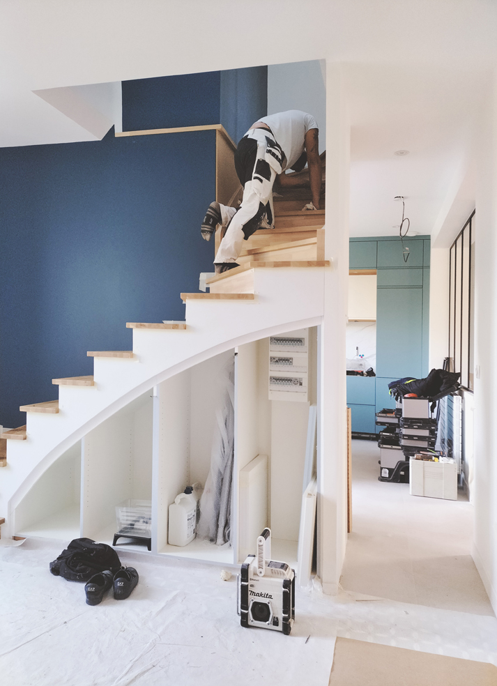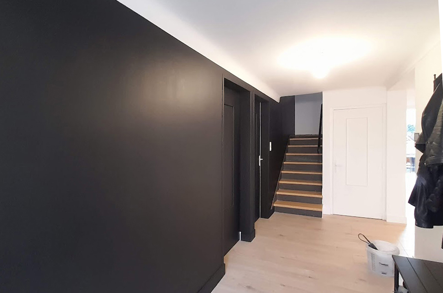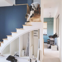 Un escalier sur-mesure pour donner le caractère du lieu dès l’entrée de la maison et des touches de couleurs pour créer de la profondeur.