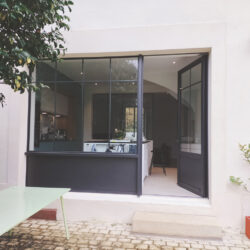 Une pièce à vivre agrandie et ouverte sur la petite cour pour aller chercher la lumière. Une rénovation énergétique avec le remplacement de toutes les baies, des isolations (en matériaux biosourcés) et l’installation d’un poêle.
