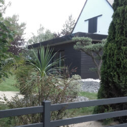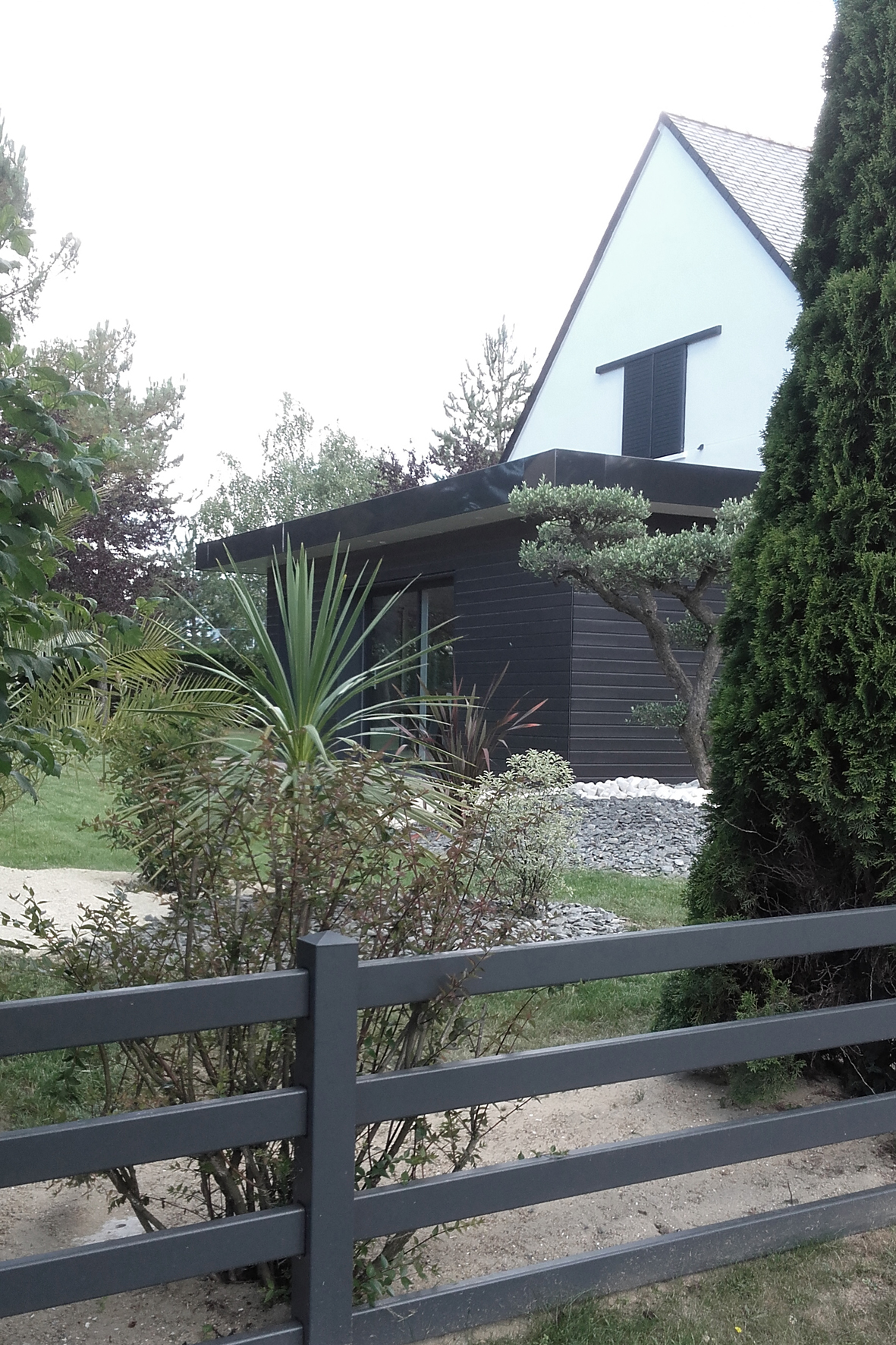 Extension en bois et avec toiture végétalisée pour cette maison en bord de Loire, sur la Divatte. Création d’une chambre, d’un bureau/chambre d’amis, une salle de bain, et une arrière-cuisine tout en jeu de volume pour s’intégrer au maximum dans le beau jardin (Architecte Paysagiste TMPaysage)